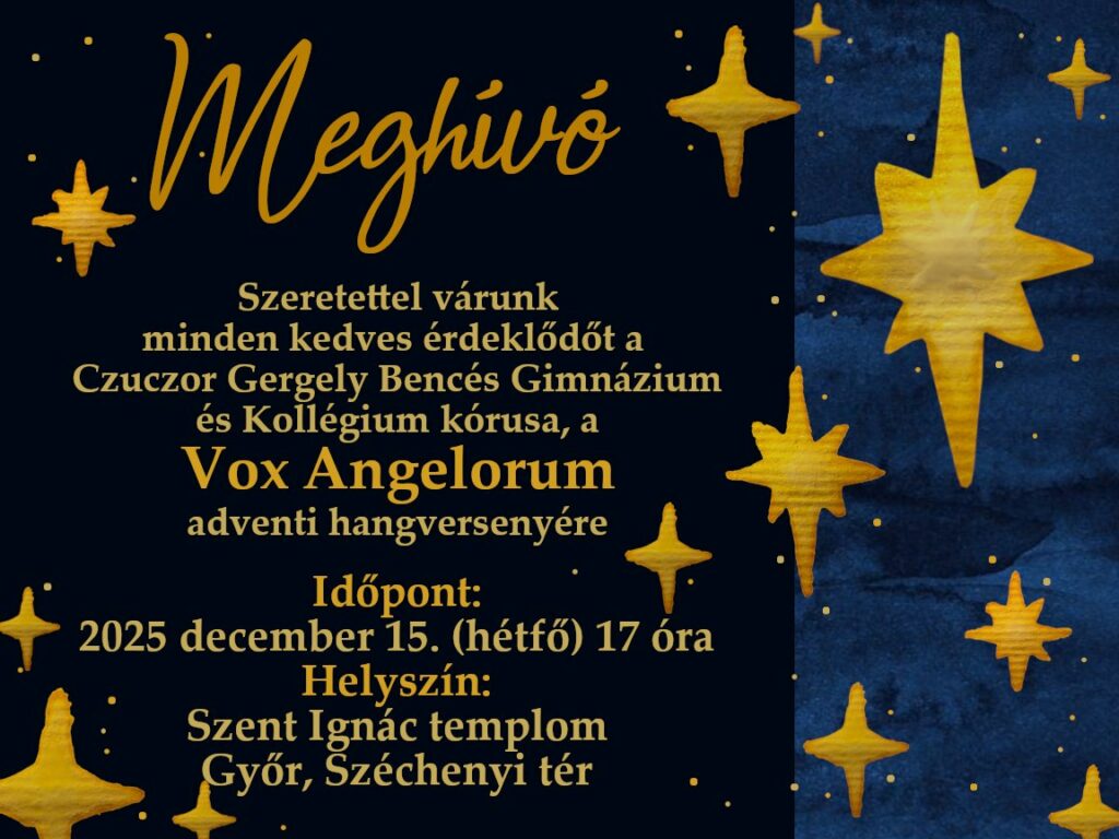 Szeretettel várunk minden kedves érdeklődőt a Czuczor Gergely Bencés Gimnázium és Kollégium kórusa, a Vox Angelorum adventi hangversenyére