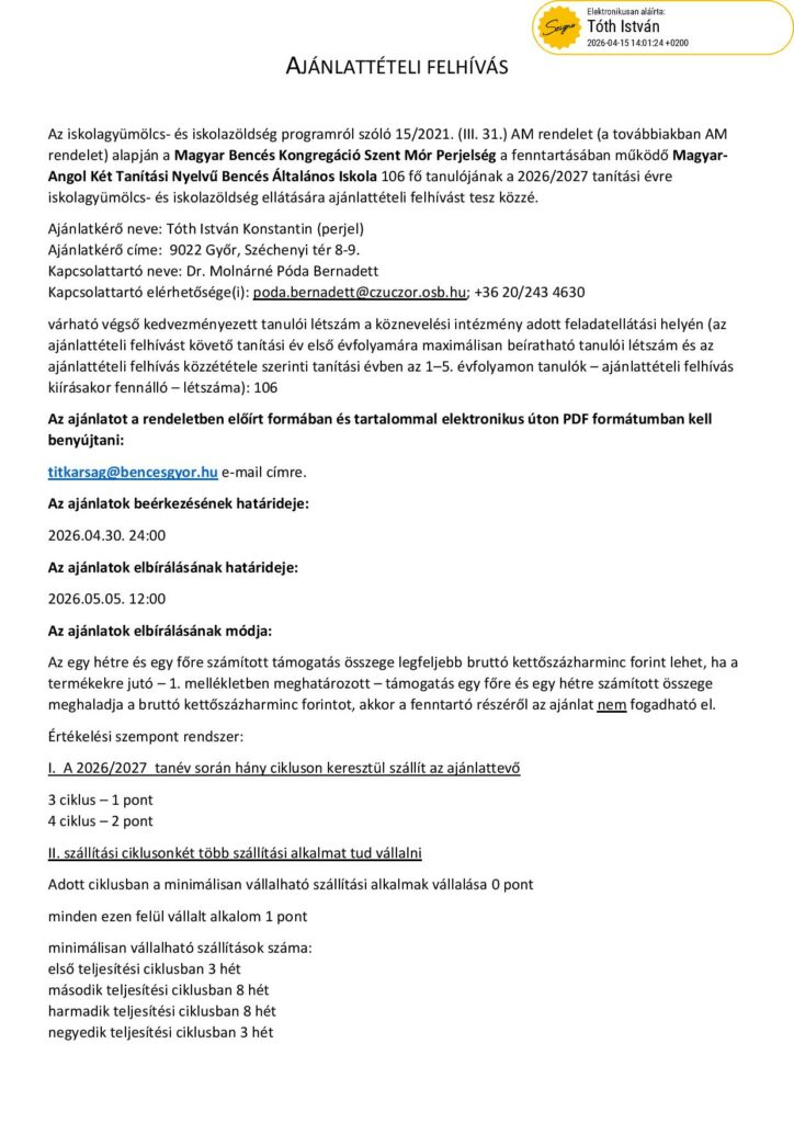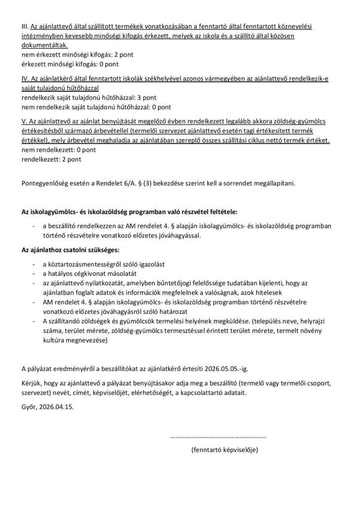 Ajánlattételi felhívás – Iskolagyümölcs és iskolazöldség-program