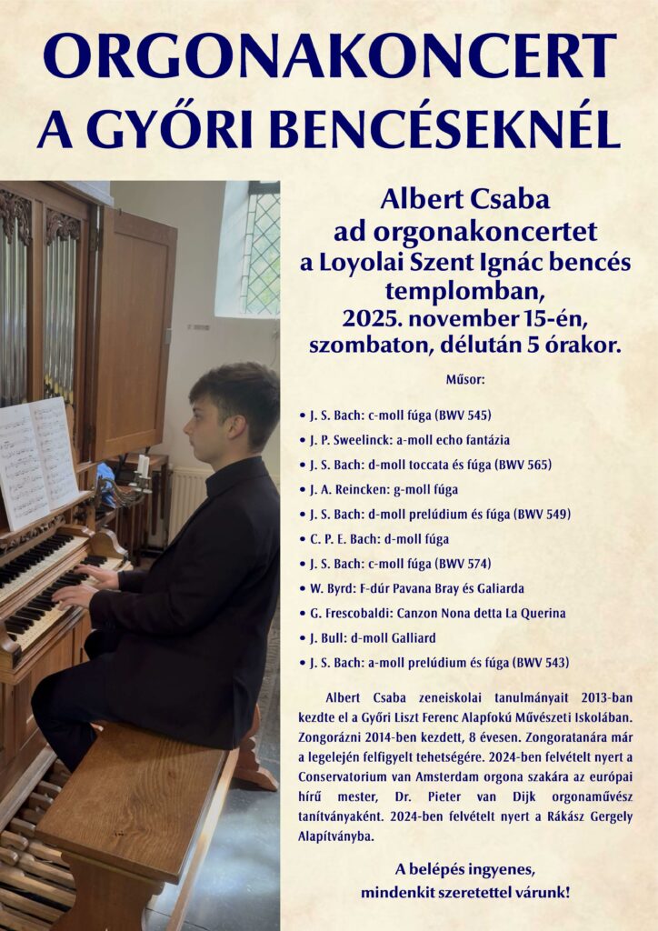 Győr szívében, a bencés templomban ad orgonakoncertet Albert Csaba november 15-én, szombaton 17 órakor.
