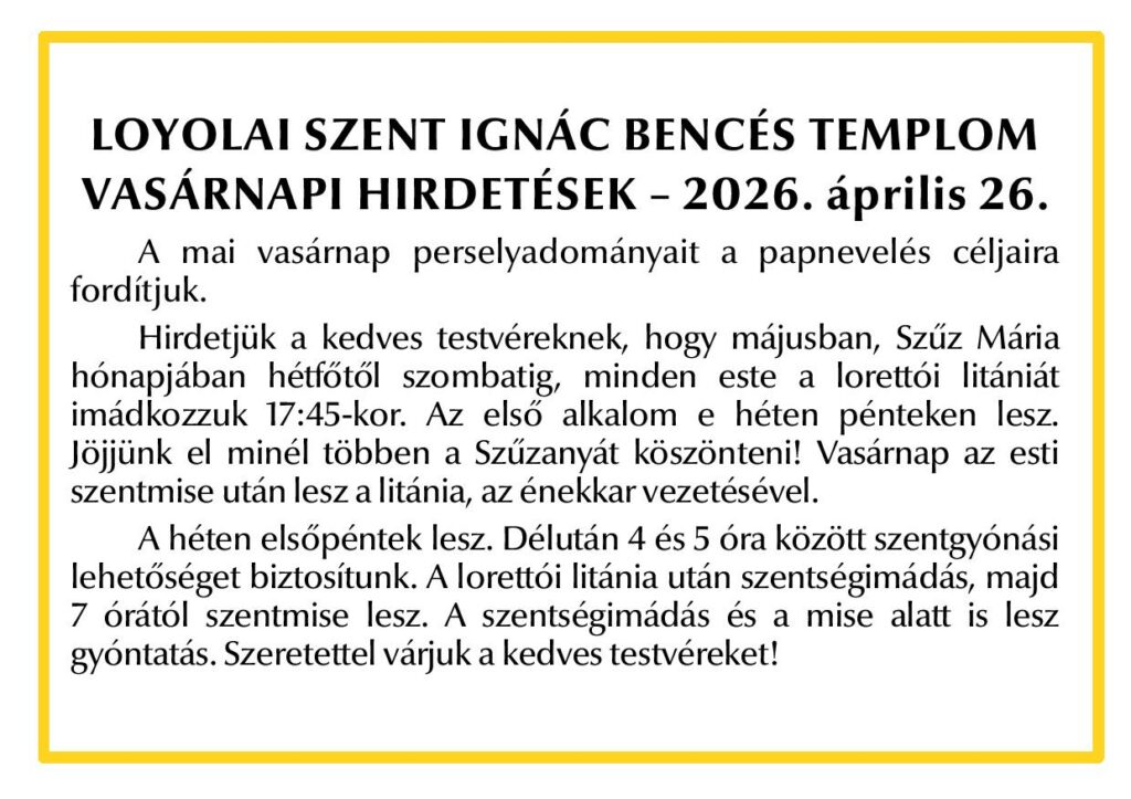 LOYOLAI SZENT IGNÁC BENCÉS TEMPLOM VASÁRNAPI HIRDETÉSEK – 2026. április 26.