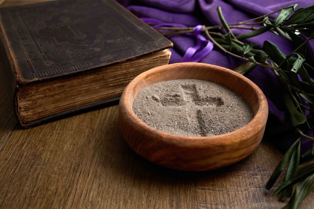 Ashes with cross in bowl with old bible and olive branches, representing lent