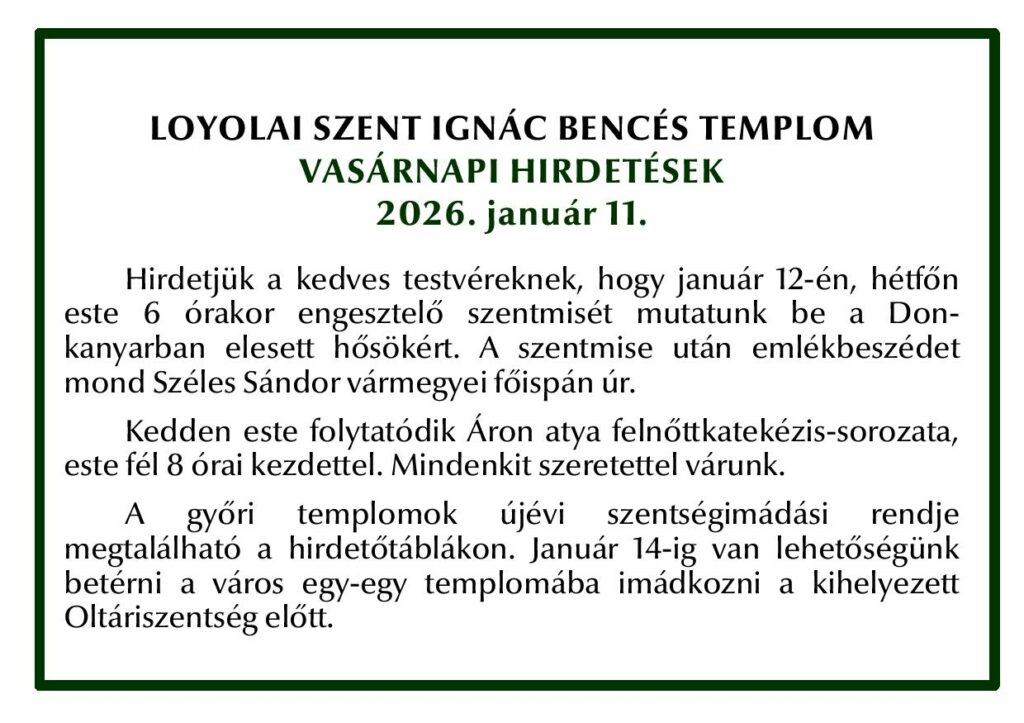 LOYOLAI SZENT IGNÁC BENCÉS TEMPLOM – VASÁRNAPI HIRDETÉSEK 2026. január 11.