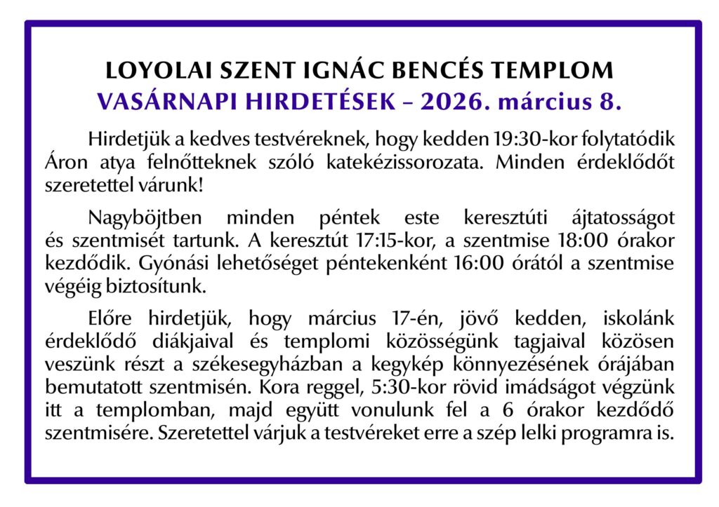 LOYOLAI SZENT IGNÁC BENCÉS TEMPLOM VASÁRNAPI HIRDETÉSEK – 2026. március 8.