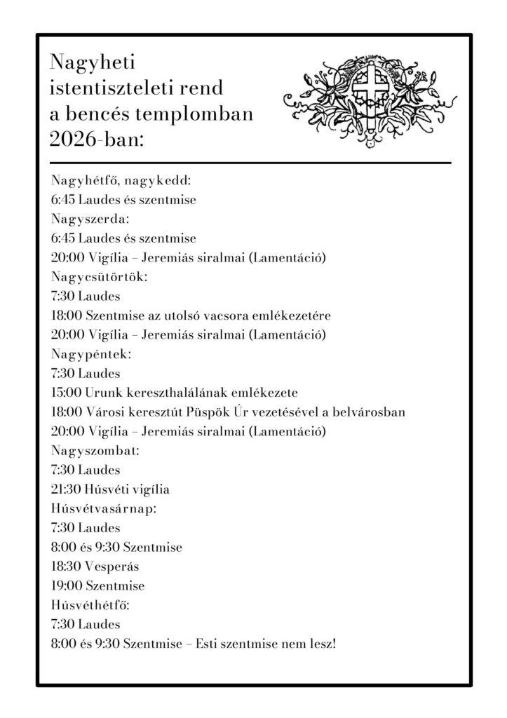 Nagyheti istentiszteleti rend a bencés templomban 2026-ban: